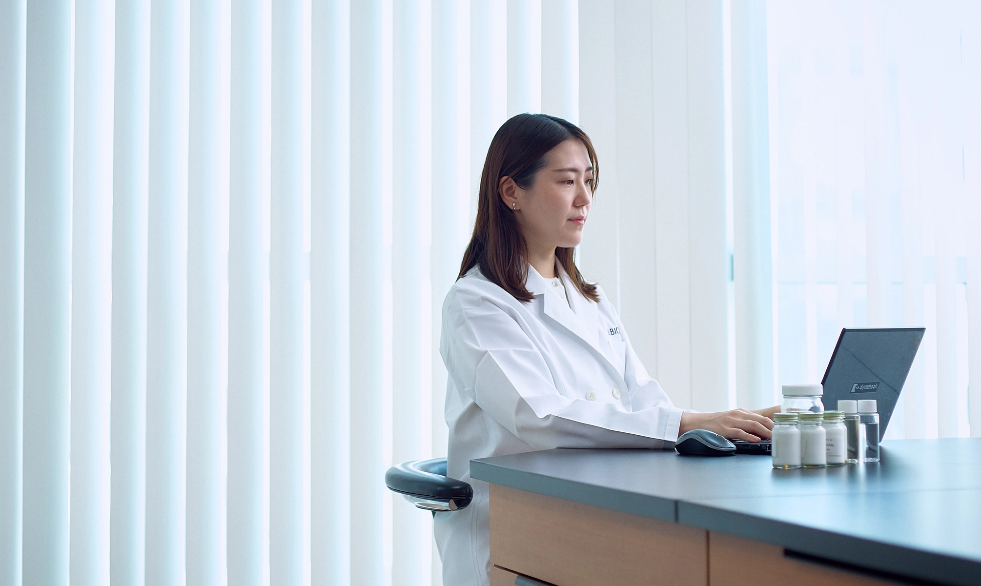 製品開発では、商品開発部から立案された新製品企画に基づき、アイテムごとに成分の選定や配合比率などの処方を検討します。