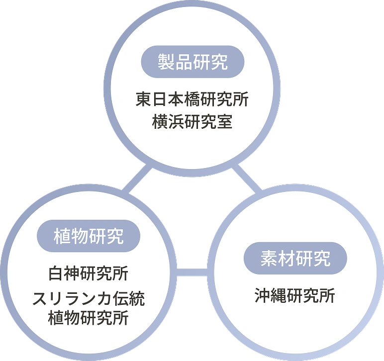 独創的なアイデアと最先端の技術が融合した個性あふれる化粧品づくりを推進する製品研究、自社農場で行う有機栽培や最新の植物バイオテクノロジーによって育まれる植物研究、オリジナリティのある原料の開発や探索を通し新しい価値を創造する素材研究、これら3つの研究を国内外各拠点の特性を活かし推進することで、お客様の期待を超える新しい商品づくりに挑戦しています。