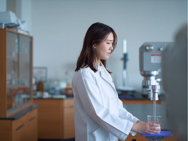 乳液・化粧水・クリーム・美容液など、スキンケア製品の製剤化研究に取り組んでいます。最先端の新規製剤技術の研究や、 他社と連携した独自原料の共同開発も積極的に推進しています。また、 既に発売をした商品においても、お客様からのご意見や営業現場の声を汲み取りながら、商品リニューアル時に品質向上に努めるなど、長期的な視座で製品開発に取り組んでいます。